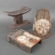Afrikaans houten ngontang helmmasker met vier gezichten rondom, Fang, een rechthoekig Afrikaans houten masker met rood-witte beschildering, mogelijk Ngil, Fang, en een Afrikaans houten neksteun, alle West-Afrika, afmetingen ngontang-masker 34 × Ø 21 cm
