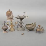Diverse bronzen Aziatica, waaronder: olielampje, wierookbrander, en specerijendoos -één pootje los bijgevoegd-