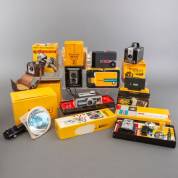 Verzameling diverse Kodak camera's en toebehoren, waaronder: Brownie Reflex, Brownie Starflex, en Brownie Auto 27 -gebruikssporen en missende delen uit verpakkingen-