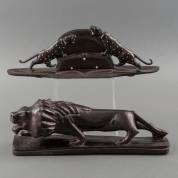 Twee houtsnijwerken: leeuw, en twee tijgers, langste 37 cm