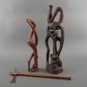 Drie Afrikaanse objecten: smeedijzeren bijl met houten heft, Tanzania, en twee moderne abstracte sculpturen, alle tweede helft 20e eeuw, grootste beeld 58 cm hoog