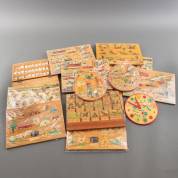 Twaalf houten puzzelplankjes, een klok en een aap-noot-mies leesplankje, jaren '50