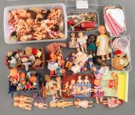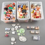 Verzameling poppenhuispopjes en -accessoires, 20e eeuw -gebruikssporen-, circa 10 cm