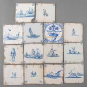 Veertien aardewerk tegels met diverse blauw-witte decors, 17e-19e eeuw -defecten-, 13 × 13 cm