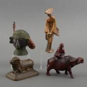 Goudkleurig gietijzeren beeldje: Japanse geisha, bronzen presse-papier in de vorm van de Indiase heilige koe Nandi, Chinees houten beeldje: lezend kind op een karbouw, en gepatineerd bronzen beeldje van een Gauri hoofd, India, hoogte Geisha 18 cm