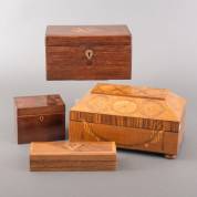 Vier houten kistjes: pennenbakje, mahoniegefineerd theekistje, palissandergefineerde theekist met bloemmarqueterie, en kist met inlegwerk en zebrano randen, grootste 15 × 29 × 17 cm