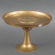 Messing tazza op ronde, deels gedraaide voet, centraal met opengewerkt ornament met klaverdecor, 19e/20e eeuw, 17 × Ø 25,5 cm