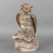 Gipsen beeld: uil leest boek, uitvoering Gebrüder Micheli, Berlijn, begin 20e eeuw -enkele beschadigingen, verflaag sleets-, hoogte 45 cm