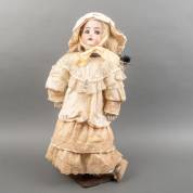 Antieke pop met biscuit hoofd, bruine ogen en open mond met tandjes, originele kleding, gemerkt Simon & Halbig Kämmer Reinhard, nr. 73, Duitsland, begin 20e eeuw -gezicht met miniem krasje op het voorhoofd, lijf en leden sleets, kleding moet gereinigd worden-, 70 cm