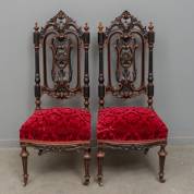 Twee gezwart houten stoelen met opengewerkte rug en rood velours bekleding, Willem III -defecten aan bekleding-