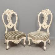 Paar witgelakte damesstoelen op wieltjes, de opengewerkte rugleuning met decor van bloemen en bladeren, gestreepte groen velours bekleding, midden 19e eeuw, 99 × 55 × 53 cm