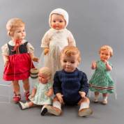 Vijf poppen, waarvan één jongenspop, met barsten en gat in het hoofd. jaren '40-'60 -bespeeld-, 47 cm
