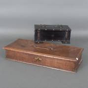 Breed eikenhouten kistje, en zwartgelakt houten kistje met metalen beslag, grootste 10 × 54 × 22 cm