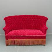 Gecapitonneerd rood velours tweezits bankje, 19e eeuw -gebruikssporen-, 88 × 157 × 80 cm