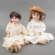 Twee poppen met biscuit hoofd, waarvan één met slaapogen en gemerkt Armand Marseille -defect aan knie-