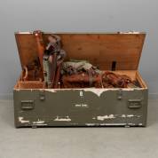 Houten kist met grote verzameling Zwitserse legeruitrusting, waaronder: rugtassen, statieven, duivenkooitje, en diverse kleine uitrustingtasjes, midden 20e eeuw -enkele delen mottig-, kist 43 × 125 × 64 cm