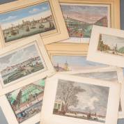 Zes ingekleurde opticaprenten met Nederlandse stadsgezichten, en drie ingekleurde gravures, 18e eeuw