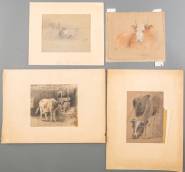 Hendrik / Henry van Ingen (1833-1898), vier schetsen van koeien, houtskool, potlood, rood en wit krijt op papier, alle gesigneerd, vermoedelijk gemaakt rond 1850-1860 -defecten-, circa 20 × 25 cm