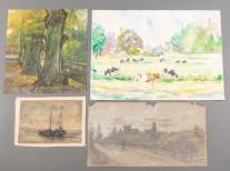 Vier werken: Theodoor Soeterik (1810-1883), 'Gezigt op de stad Bentheim - naar de natuur geteekend', krijt op papier, l.o. gesigneerd en gedateerd aug. 1871 -beschadigd-; Herman M.G. Verkerk (1880-1927), eiken langs de gracht, aquarel op papier, r.o. gesigneerd en gedateerd '05; platbodems op het strand, aquarel en potlood op papier, niet gesigneerd; en koeien in weiland, aquarel op papier, r.o. gesigneerd Kees Sanders, laatstgenoemde 42 × 56 cm