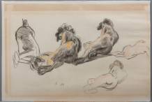 Mogelijk Leo Putz (1869-1940), studietekening van liggende naakten, krijt op papier, m.o. gemonogrammeerd L.P., 30 × 45 cm