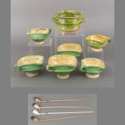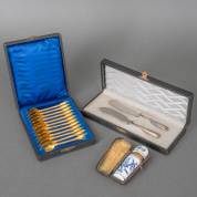 Etui met twaalf vergulde metalen theelepels, hartfilet, uitvoering Christofle, porseleinen parfumflacon met 14kt gouden montuur en stop, in etui, en etui met twee kaasmesjes met 3e gehalte zilveren heft, mesjes 15,5 cm