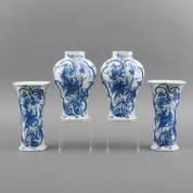 Vierdelig Delfts aardewerk kaststel met blauw-wit vogeldecor, gemerkt, uitvoering De Porceleyne Bijl, 18e eeuw -schilfers, deksels ontbreken-, hoogte 22 cm