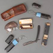 Vijf diverse brilletjes, twee pijpjes en een scheermes, alle in foedraal of koker -gebruikssporen-