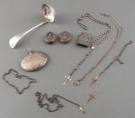 Divers zilver en onedel, waaronder: drie rozenkransen met doosjes, en verzilverde sauslepel