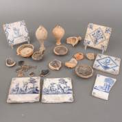 Divers archeologisch aardewerk en diverse fragmenten daarvan, waaronder lage kommetjes, Middellandse Zeegebied, hellenistische en Romeinse periode, grootste 15 × Ø 6 cm, herkomst: privécollectie oud-directeur Museum Kam, Nijmegen, daarbij: vijf blauw-witte aardewerk tegels en een fragment, veelal 17e eeuw