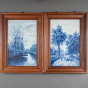 Paar blauw-witte aardewerk wandplaquettes: schaapskudde en herder op landweg, naar schilderij van Julius Jacobus van de Sande Bakhuyzen; en bootje op vaart, naar schilderij van Fredericus Jacobus van Rossum du Chattel, uitvoering Villeroy & Boch, Mettlach, 50 × 32 cm