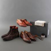 Twee paar bruin lederen herenschoenen, maat 9, en een paar donkerbruine suède enkellaarzen, maat 9½, alle uitvoering Santoni