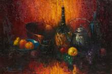Peter Brouwer (1935-2010), stilleven met ketel, wijnfles en fruit, olieverf op doek, l.o. gesigneerd, 82 × 122 cm