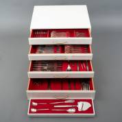 Twaalfpersoons verzilverd bestekgedeelte, Sola Elite 100, bestaande uit: twaalf grote couverts, twaalf kleine couverts, twaalf grote en kleine messen, twaalf fruitmesjes, twaalf fruitcouverts, elf koffielepels, elf dessertlepels, twaalf theelepels, en uitgebreid dienbestek, in cassette -defecten aan de cassette-, 30,5 × 46 × 35,5 cm