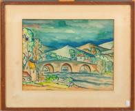 Aquarel: gezicht op een brug in een berglandschap, r.o. onduidelijk gesigneerd en gedateerd '54, 24 × 30 cm