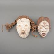 Afrikaans witgekalkt houten masker, Punu, Gabon, en witgekalkt houten masker, het haar van touw, Igbo, Nigeria, 20e/21e eeuw, inclusief haar 30 × 40 cm