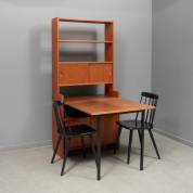 Teakgefineerd wandsysteem, Model Deco, ontwerp Poul Cadovius, uitvoering KLM, bestaande uit: onderkast met schuifdeurtjes en twee opzetstukken, waarvan één met schuifdeurtjes en bureaublad met zwarte metalen poten, jaren 60 -gebruikssporen-, 179 × 84 × 120 cm, daarbij: twee zwartgelakte spijlenstoeltjes, jaren '60