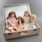 Koffer met twee biscuit poppen en twee andere poppen, daarbij: enige poppenkleertjes