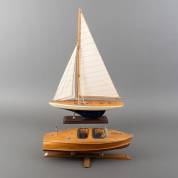 Twee houten modelboten: speedboot, en zeilschip, beide op standaard -speedboot heeft krimpscheur op het dek-, 45 × 17 cm