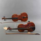 Twee altviolen: de ene met label: Neuner & Hornsteiner, Mittenwald, gedateerd 1890, tevens met restauratielabel: Gg. Stössel, Keulen, 1907, corpuslengte 38 cm -kam los maar aanwezig, halsvoet onvakkundig gelijmd-; en één zonder label, corpuslengte 38,5 cm -kam los maar aanwezig-; beide met strijkstok en koffer