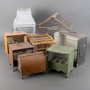 Acht houten vogelkooien -intensief gebruikt-, hoogte grootste 47 cm