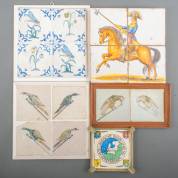 Diverse tegeltableaus: vierpas tableau met polychrome decoratie van ruiter te paard, vierpas tableau met bloemen en libelles, vierpas tableau met spijkertegels, tweepas tableau met spijkertegels, alle 20e eeuw, daarbij: plateel tegel 'Hollandsche Bank-Unie N.V. Amsterdam' vermaakt tot asbak, ruiter 28 × 28 cm