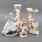 Porseleinen beeld: danseres, uitvoering Schaubach Kunst, Wallendorf, Duitsland (1926-1953), twee biscuit schalen gedragen door putti, en drie porseleinen beeldjes van kinderen -minieme defecten-, danseres 28 cm