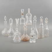 Diverse glazen en kristallen karaffen waarvan één met 2e gehalte zilveren montuur, 19e/20e eeuw, grootste 36 × Ø 12 cm