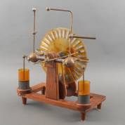 Wimshurst machine voor het opwekken van elektrostatische spanningen, uitvoering Philip Harris & Co Birmingham, begin 20e eeuw -riemen slippen-, 55 × 45 × 30 cm