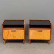 Paar teak- en berkengefineerde nachtkastjes met zwarte glazen bladen en klep -gebruikssporen-, 50 × 50 × 36 cm