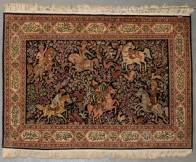 Indiaas zijden wandtapijt Kashmir met jachtdecor en inscripties in de rand -messing draagstang verbogen-, 128 × 178 cm