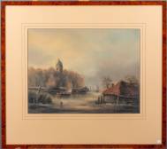 Hollandse School: bootjes op het water met in de voorgrond een boothuis en in de achtergrond een toren, pastel op papier, l.o. gesigneerd A. Booij, mogelijk Adrienne Johanna de Booij (1863-1937), 53 × 40 cm