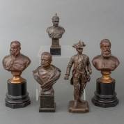 Vijf beelden Duitse vorsten en regeringsleiders: bronzen buste keizer Wilhelm II, bronzen buste Paul von Hindenburg, zamak buste keizer Friedrich III -defect aan voet-, zamak buste keizer Wilhelm I, zamak beeld koning Frederik de Grote -staf afgebroken-, hoogte 28 cm