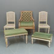 Twee stoelen en een armstoel, alle drie met rotan bespanning, en twee hockers, alle Louis Seize-stijl -gebruikssporen-