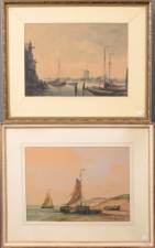 Adriaan Christian W. Terhell (1863-1949), twee werken: duingezicht met twee botters, en havengezicht met molens in het verschiet, aquarel op papier, beide gesigneerd, 26 × 38 cm